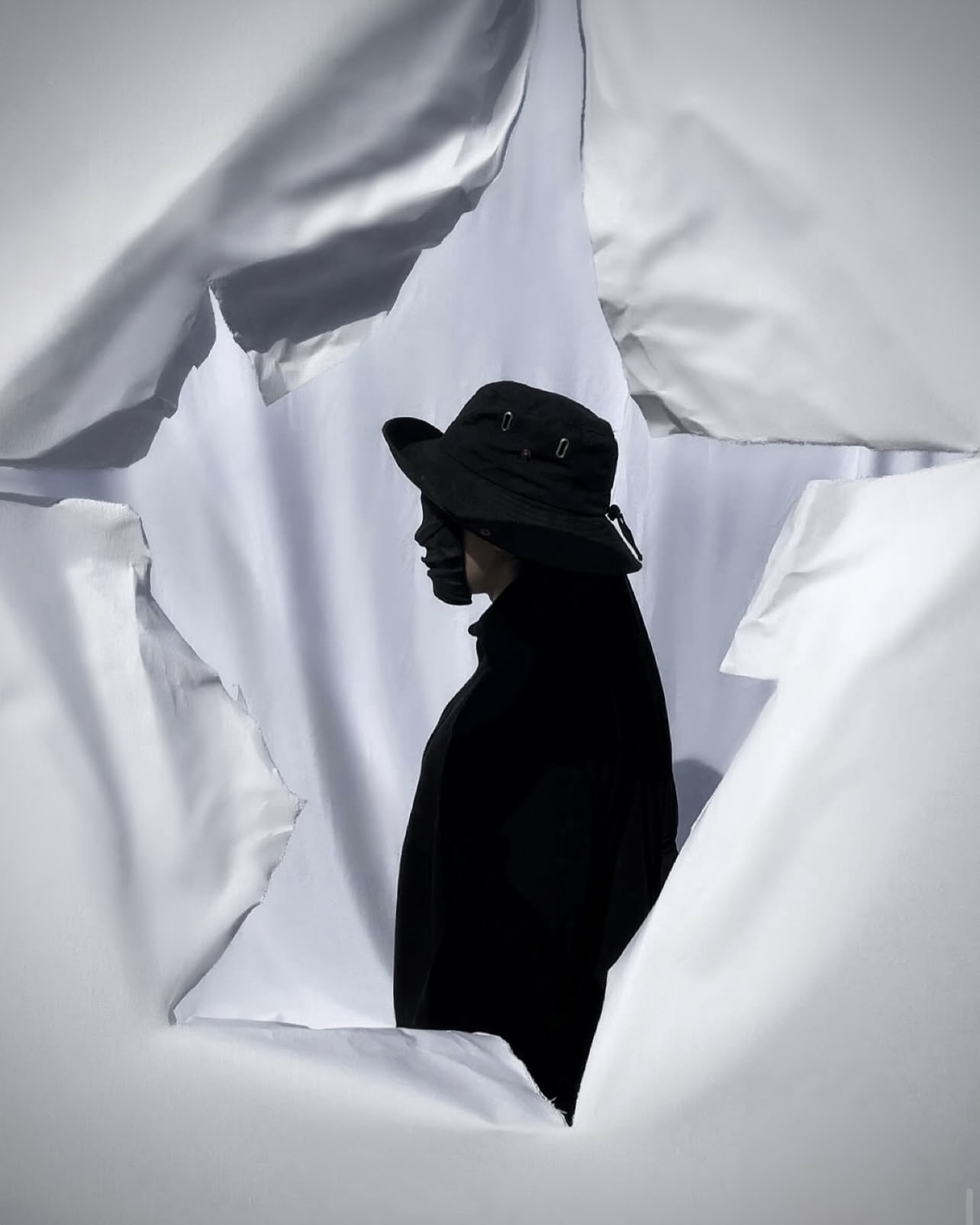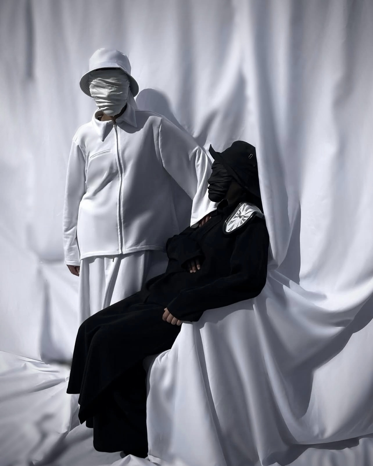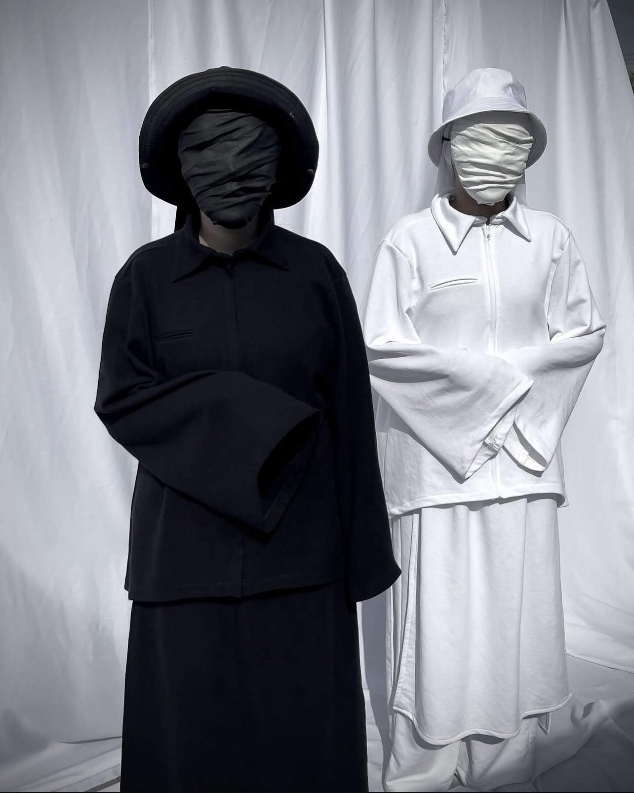 Il se compose de deux pièces : une veste ample à zip frontal et col chemisier, et un pantalon fluide avec système de serrage et jupe intégrée à fente latérale, pour plus d’aisance à chaque pas.